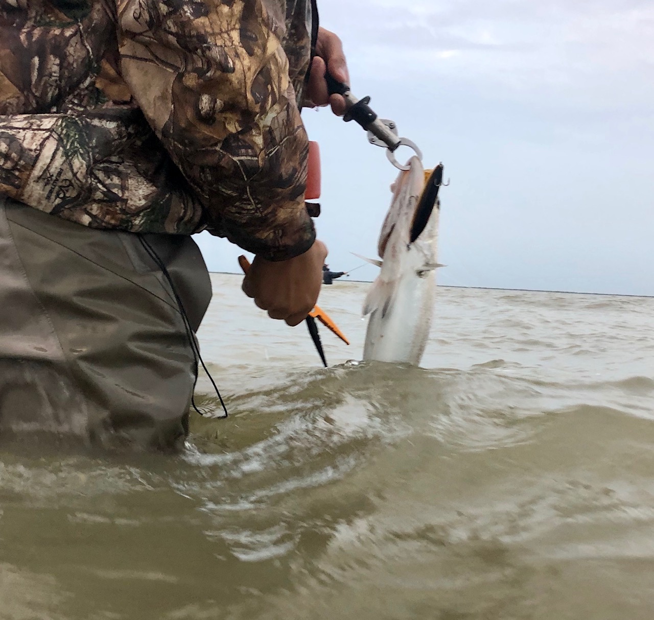 Knee to waist deep shell/mud with DSL chicken of the c, topwaters, and custom Softdine XL’s.